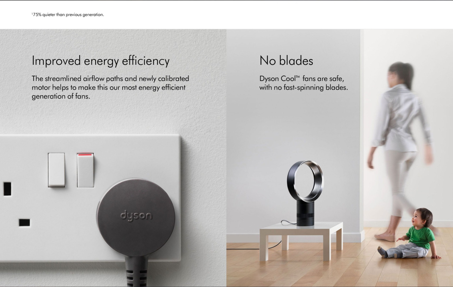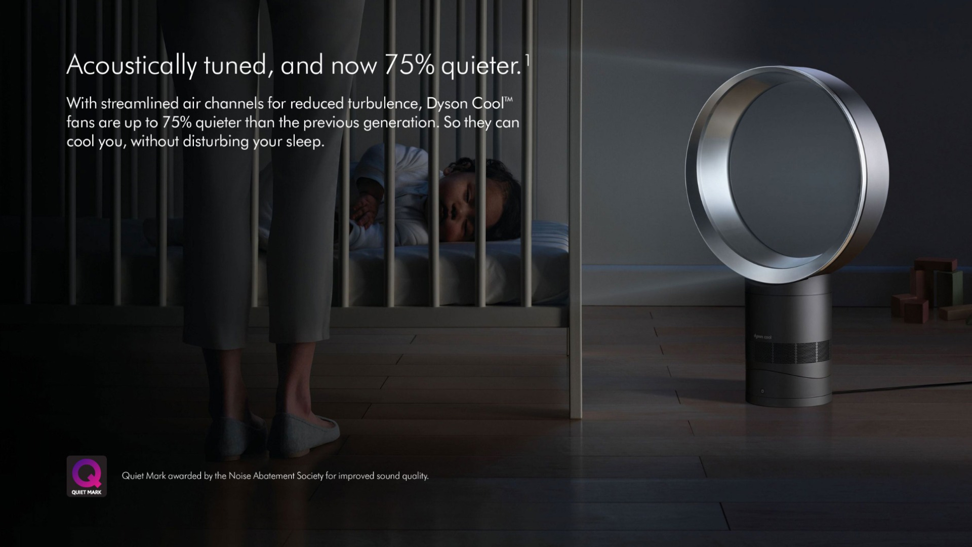 Dyson's unique Air Multiplier™ technology is revolutionary. It delivers a stead stream of cooling air which is not only more effecient than conventional fans, but also extremely quiet, it's had up to 60% of it's noise reduced compared to other models